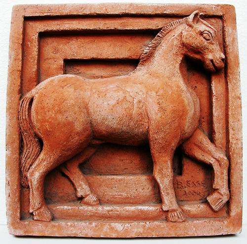 Cavallo al galoppo 25x25, terracotta*, 2003/4, collezione privata* terracotta dei mattonari, rosa antico. Può essere riprodotta su richiesta senza calco