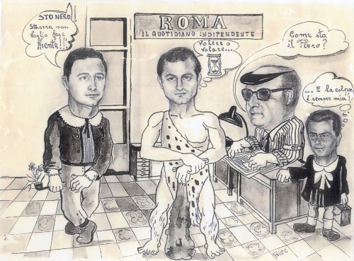 1966. Alcuni collaboratori della redazione del Giornale Roma. Ritrae da sinisrta: Piero De Franciscis, Ennio Amato, il direttore Prof. Scialla, Domenico Mingione. Dopo aver messo in ridicolo tanti politici, ho voulto trattare alla pari anche i collaboratori del giornale, per spirito di equità.